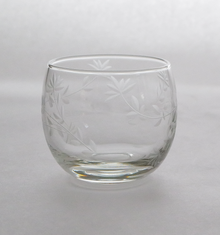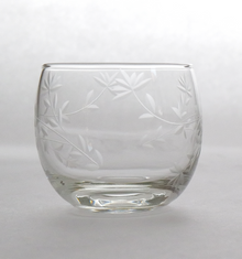 A clear glass lowball tumbler featuring delicate etched botanical decoration. The rounded glass has a softly curved profile with a thick, weighted base that gives the piece a substantial feel in the hand—typical of rocks or whiskey glasses.