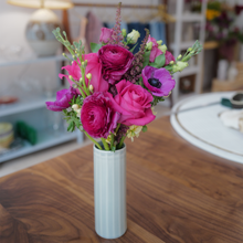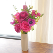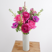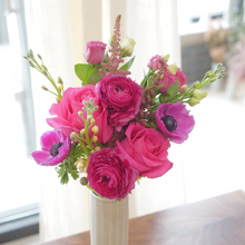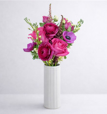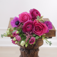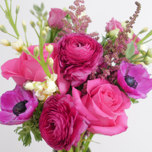 Fresh flower bouquet of high end stems in deep pinks, bright purples, and touches of cream.