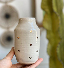 Handmade ceramic bud vase with gold hearts. Each piece varies slightly due to its handmade nature.