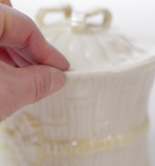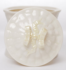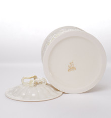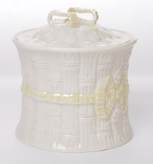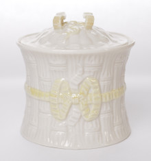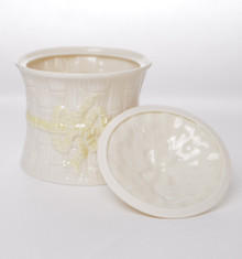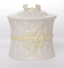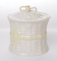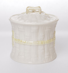 This lidded biscuit jar is made from fine Irish Parian porcelain by Belleek. The jar has a base is a bamboo texture in creamy ivory with a textured yellow ribbon. The jar's glaze has an iridescent effect. The backstamp is the 7th generation, dating this piece between 1980 - 1993.