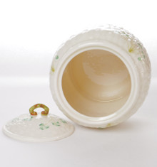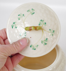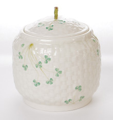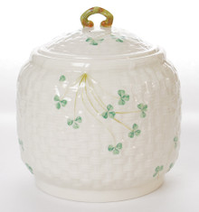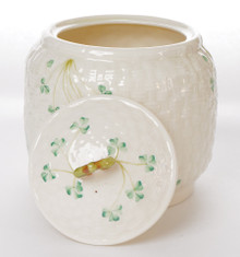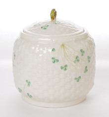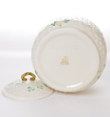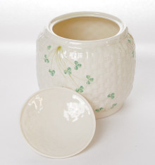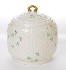 This lidded biscuit jar is made from fine Irish Parian porcelain by Belleek. The jar has a base is a basket weave texture in creamy ivory with Shamrocks painted on the jar. The backstamp is the 7th generation, dating this piece between 1980 - 1993.