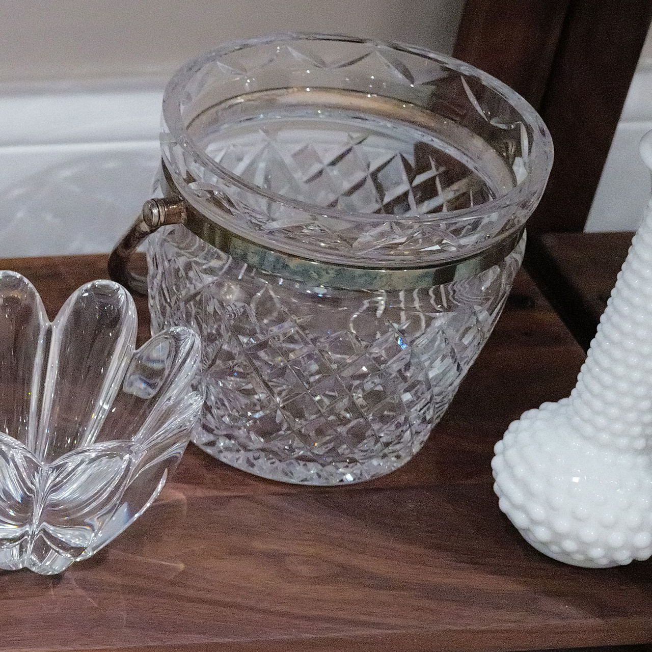 Pressed Glass Ice Bucket with Silver Plated Handle