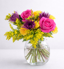 Bouquet of bright and cheery flowers, with a wild spirit. Mix of bright pinks, deep purples, and poppy yellow.