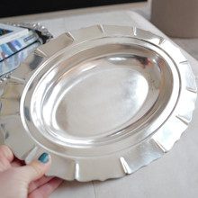 The dish is adorned with a scalloped edge, offering a subtle yet striking Art Deco flair that reflects its 1930s origin. Silver-plated on copper with a butler finish, this exquisite dish boasts a bright, reflective surface and high shine, perfect for adding a touch of vintage sophistication to any table setting or décor.