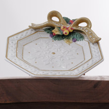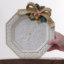 A classic Fitz and Floyd holiday plate featuring a beautifully sculpted gold ribbon, hand-painted berries, evergreen sprigs, and raised scrollwork. The plate’s octagonal shape, dimensional detailing, and vibrant painted accents are signature Fitz and Floyd—festive, ornate, and full of charm.