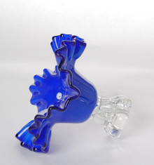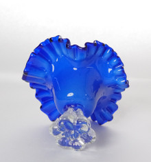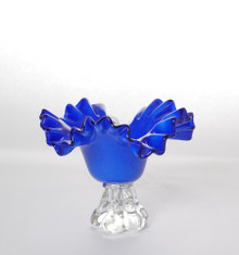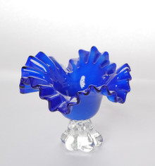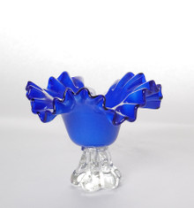 Handblown art glass bowl featuring a dramatic ruffled edge and pedestal foot base. The bowl is rendered in a rich cobalt blue with a softly satin-finished body, transitioning to a darker, more translucent tone along the undulating rim. The clear glass pedestal base has an organic, sculptural form that provides stability while adding visual contrast and lightness.